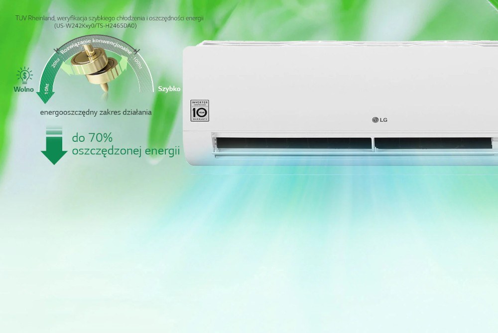Klimatyzator LG DUALCOOL STANDARD 2 gwarantuje oszczędności poboru energii elektrycznej do 70%. W jednostce wykorzystano sprężarkę Dual Inverter, która płynnie dostosowuje pracę w celu utrzymania oczekiwanej temperatury w pomieszczeniu. Jej zaletą jest działanie w najbardziej efektywnym zakresie, co przekłada się na oszczędności w zużyciu prądu, co potwierdza przyznana klasa energetyczna A++ dla chłodzenia i A+ dla ogrzewania.