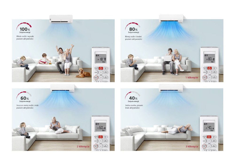 Możesz mieć wpływ na zużycie energii przez urządzenie. Wystarczy, że wykorzystasz funkcję LG Active Energy Control, dzięki której wybierzesz jedną z trzech funkcji oszczędzania energii, tj. 80%, 60% i 40%. To pozwala znacząco obniżyć zużycie prądu przy jednoczesnym braku wpływu na komfort użytkowania klimatyzacji.